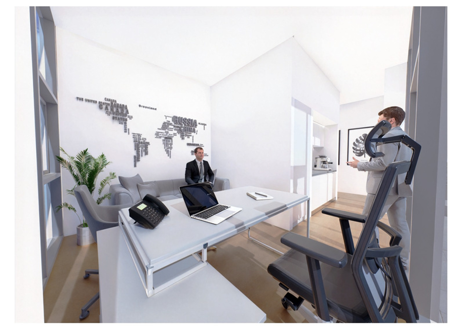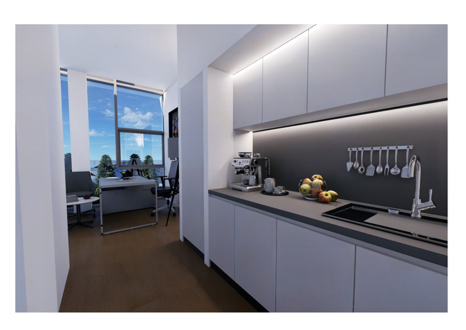 Kiracılar ve ziyaretçiler için otel rezervasyonu ve transfer gibi destek hizmetleri sunan çok işlevli bir resepsiyon alanı.